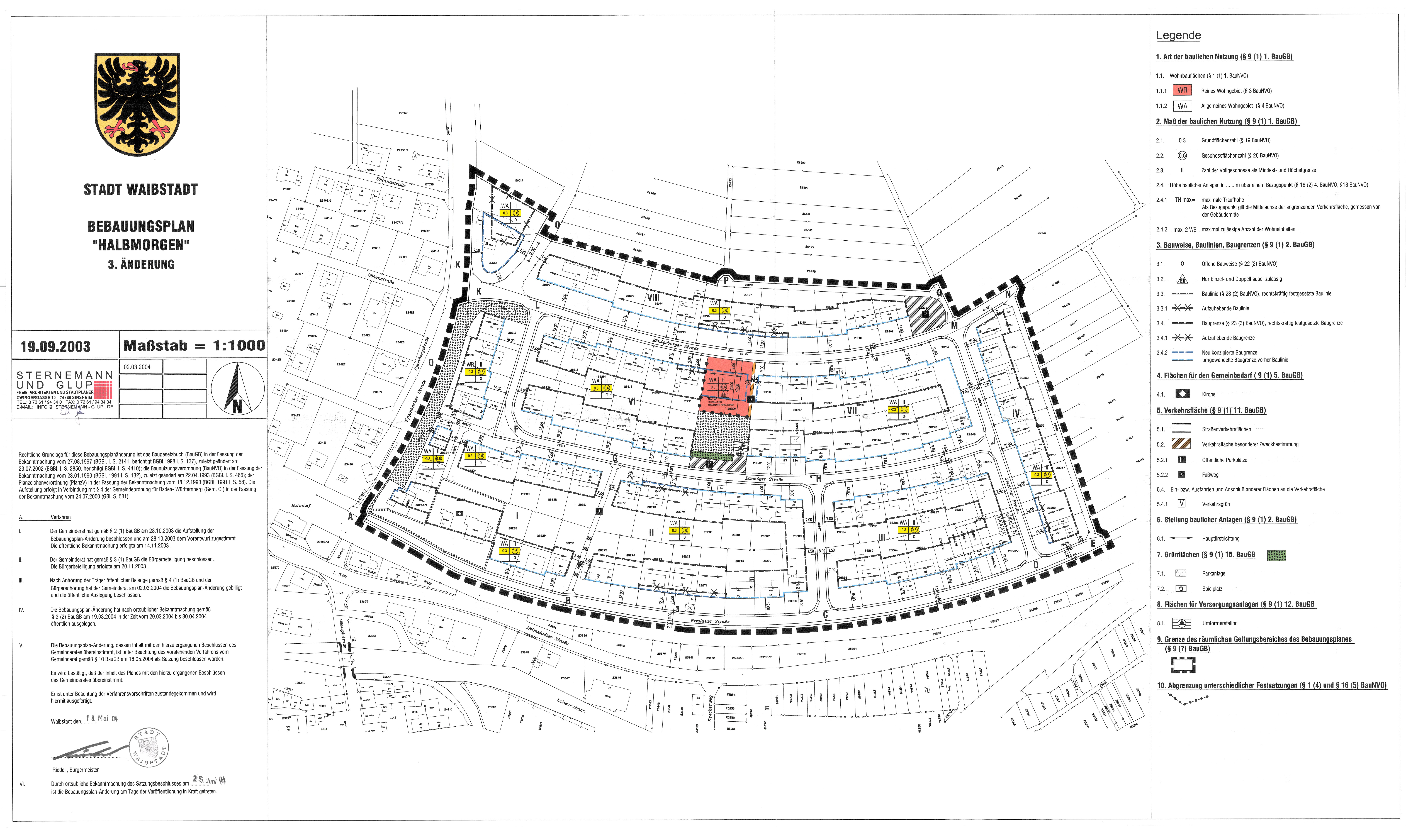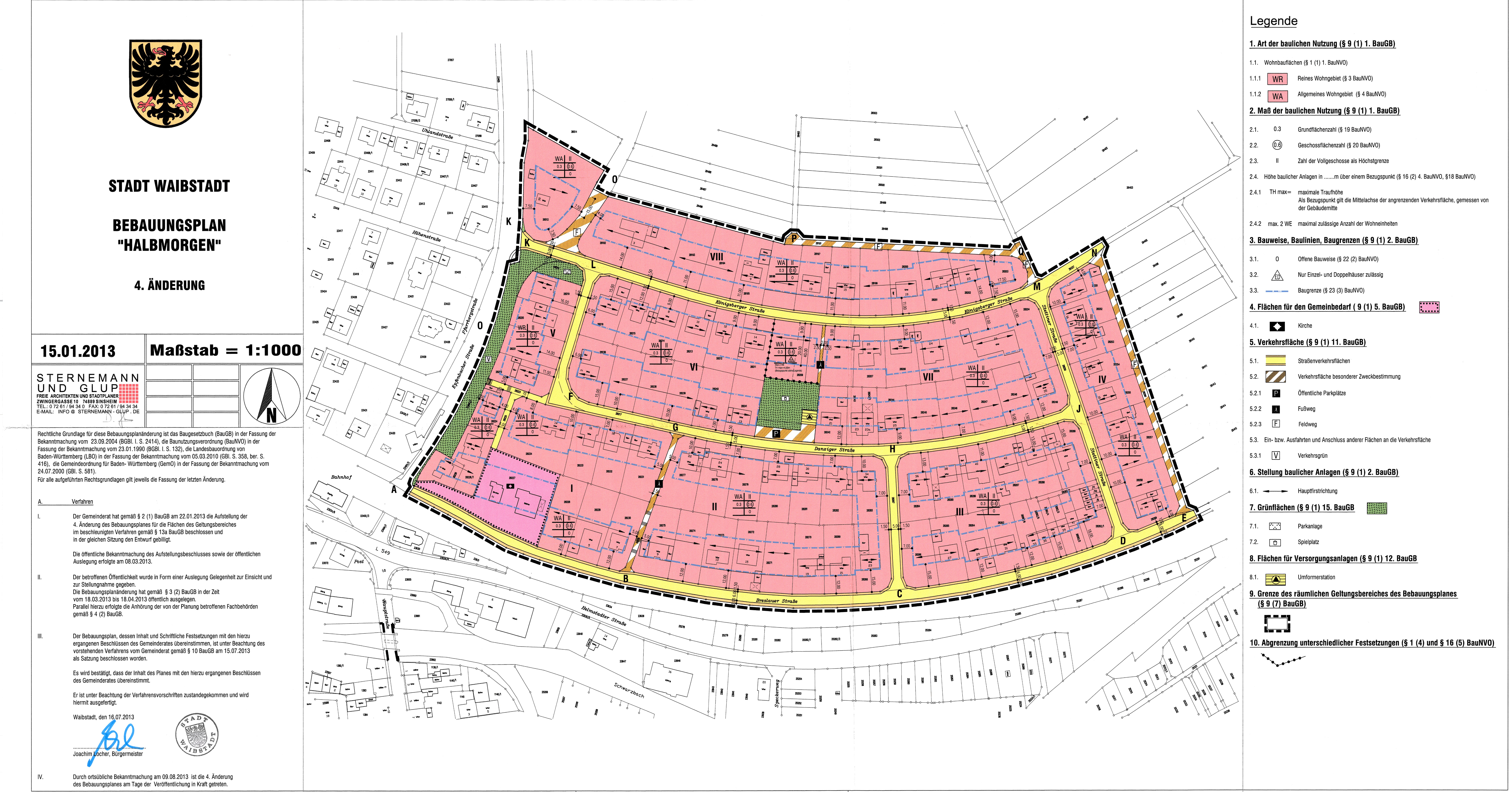Halbmorgen B-Plan Halbmorgen vom 30.10.1968 3. Änderung vom 25.06.2004 4. Änderung vom 09.08.2013 Schriftliche Festsetzungen - Halbmorgen 4. Änderung (242 KB) Örtliche Bauvorschriften - Halbmorgen 4. Änderung (156 KB) Geänderte Planinhalte - Halbmorgen 4. Änderung (228 KB)